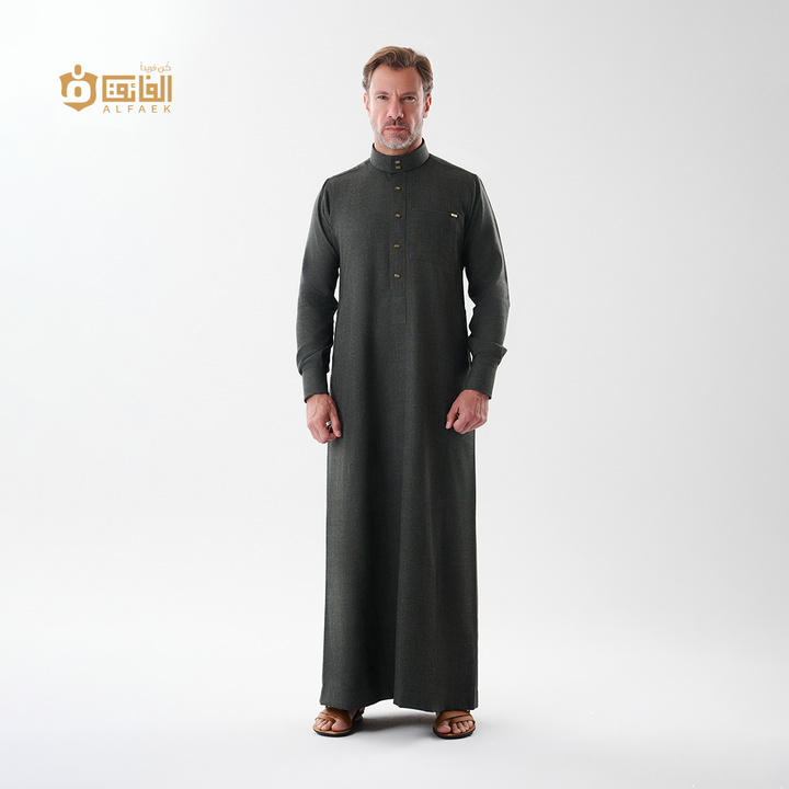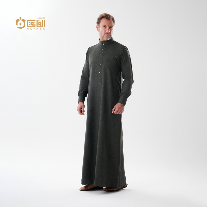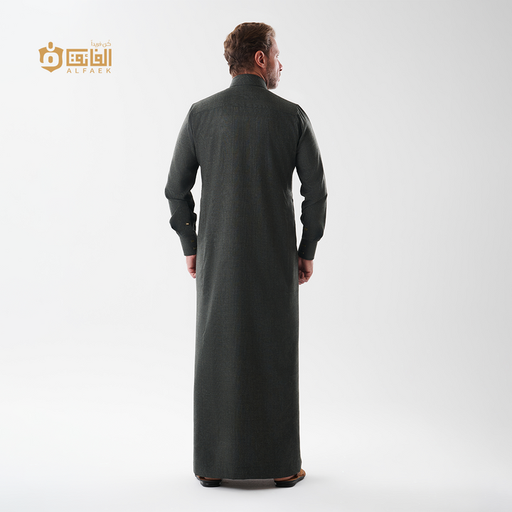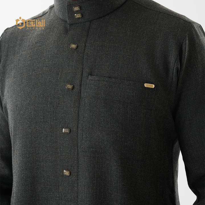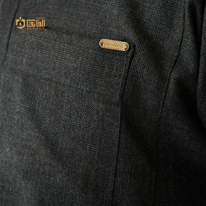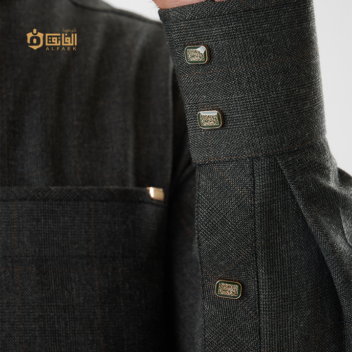 خامة ثقيلة منسوجة بخطوط كاروهات دقيقة تمنح الثوب عمقًا بصريًا راقيًا، وتفاصيل معدنية بلون ذهبي خافت تعكس ذوقًا رفيعًا لا يحتاج إلى تصريح.